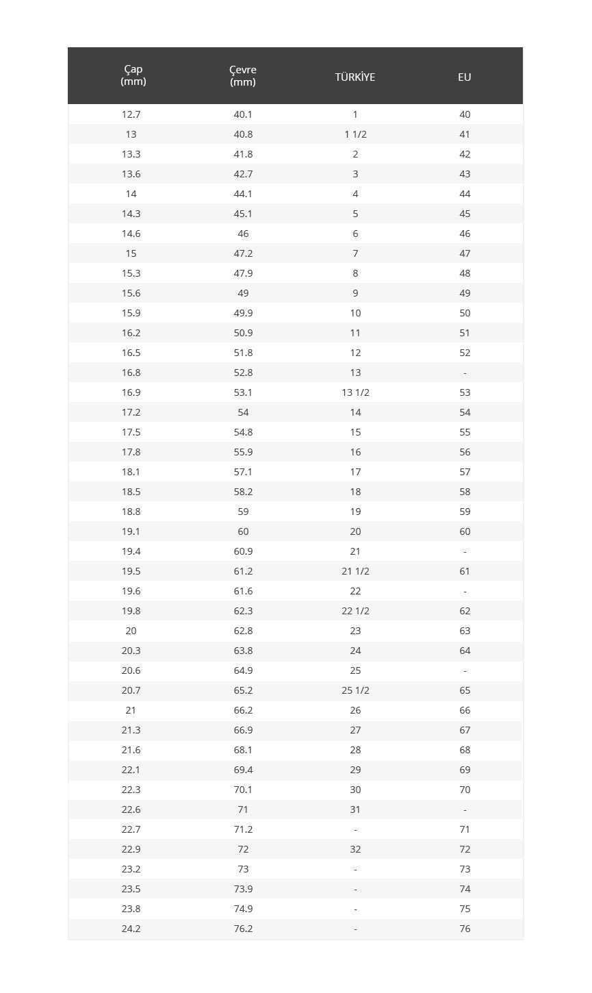 Unutmayın ki ortalama yüzük boyu kadın için 12-14 , erkek için 20-22 arası değişmektedir. Sağ elin ve sol elin parmak boyutlarının da farklı olduğunu unutmayın. Ayrıca parmak ölçünüze göre alyanslarınızın ağırlığında küçük oynaklıklar olabilir.
